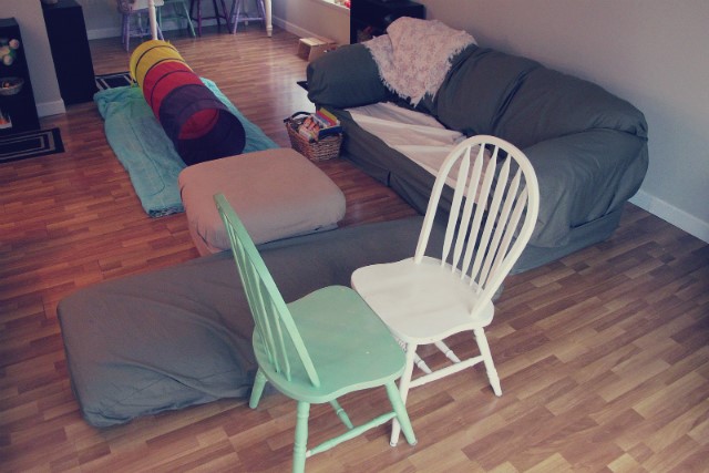 Επιστρατεύστε καρέκλες για κολώνες, σεντόνια και κουβέρτες για τοίχους και σκεπές και μαξιλάρια για τοίχους και πατώματα, για να μπορείτε να περιηγείστε στο φρούριό σας μπουσουλώντας. Μη διστάσετε να επεκτείνετε το φρούριό σας σε ολόκληρο το σπίτι και να περάσετε τη μέρα σας επινοώντας σενάρια στους πύργους και τις κατακόμβες του.