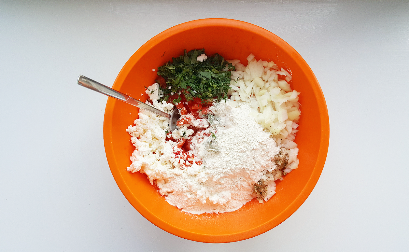 Πλένετε καλά και ψιλοκόβετε τα μυρωδικά και το κρεμμύδι και τα προσθέτετε μαζί με τα υπόλοιπα υλικά στο μπολ.