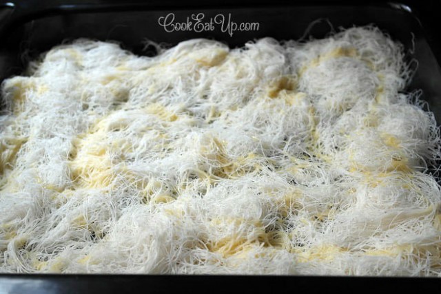 Παίρνετε λίγο απ’ το λιωμένο βούτυρο μ’ ένα πινέλο και βουτυρώνετε το ταψί σας. Αφού έχετε «ξάνει» καλά το καταΐφι σας ν’ αφρατέψει, απλώνετε το μισό στο ταψί και το περιχύνετε με το μισό απ’ το υπόλοιπο βούτυρο.