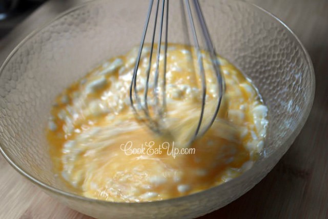 Κατόπιν, απλώνετε τη δεύτερη στρώση καταΐφι και περιχύνετε με το βούτυρο που έμεινε. Σ’ ένα μπολ, ανακατεύετε πολύ καλά τα 4 αυγά. Προσθέτετε το γιαούρτι και ανακατεύετε μέχρι το μίγμα να γίνει ομογενές.