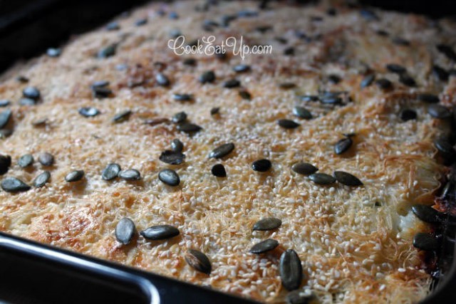 Πασπαλίζετε, τέλος, με το υπόλοιπο σουσάμι και τον κολοκυθόσπορο ή τον ηλιόσπορο και βάζετε το ταψί σε φούρνο που έχετε προθερμάνει στους 180 βαθμούς, ώσπου να ροδίσει καλά.