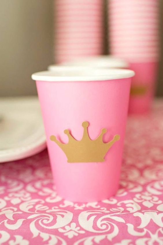 Σε πλαστικά ροζ ποτηράκια κολλήστε αυτοσχέδιες ή αγοραστές κορώνες για να συμπληρωθεί το πριγκιπικό σερβίτσιο.