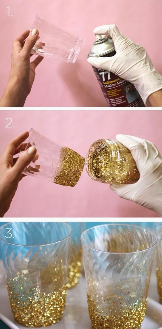 Ψεκάστε με μια κόλλα σε spray (όπως αυτή) τα πλαστικά ποτηράκια, πασπαλίστε τα χρυσόσκονη, αφήστε τα να στεγνώσουν πάνω σε μια πετσέτα και... έτοιμα!