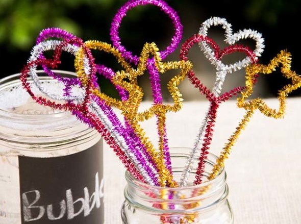 Με χρωματιστά σύρματα για πίπα (που θα βρείτε στα καταστήματα με γραφική ύλη), φτιάξτε ραβδάκια σε σχήμα αστεριού ή καρδιάς, γεμίστε ένα βαζάκι με σαπουνόνερο και, αν ο καιρός είναι καλός, αφήστε τα κορίτσια να φτιάξουν φούσκες στο μπαλκόνι.
