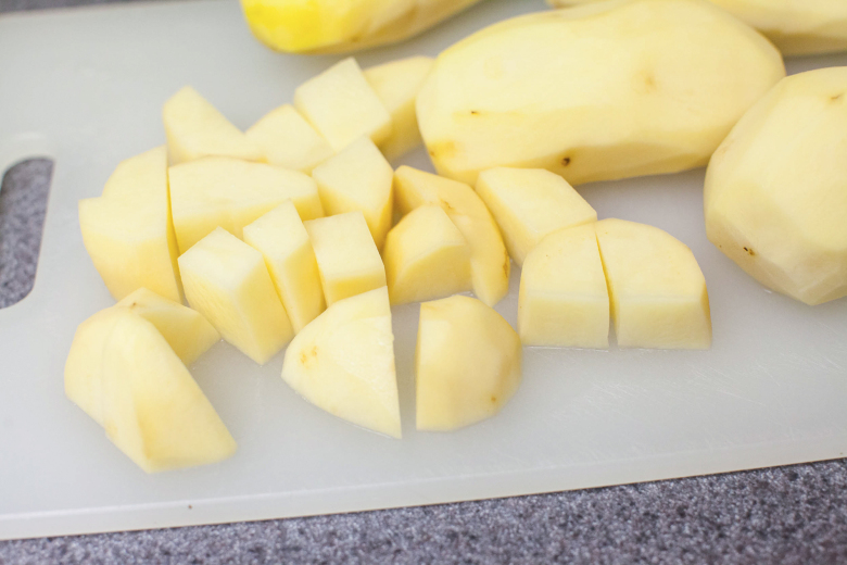 Αρχίστε το κόψιμο αλλά φροντίστε να τις κόψετε σε ομοιόμορφα κυβάκια που δεν ξεπερνούν τα 5 εκατοστά το καθένα. Έτσι, θα βράσουν πιο εύκολα και δεν κινδυνεύετε να έχετε τα μισά κομμάτια επαρκώς βρασμένα και τ’ άλλα μισά σκληρά.