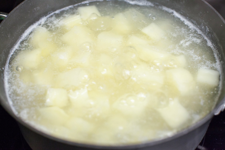 Αφήστε τις πατάτες να βράσουν σε δυνατή φωτιά. Θα χρειαστούν σίγουρα δέκα λεπτά- ίσως και λίγο παραπάνω. Για να σιγουρευτείτε ότι είναι έτοιμες, αρκεί να δοκιμάσετε αν τεμαχίζονται εύκολα με ένα πιρούνι.