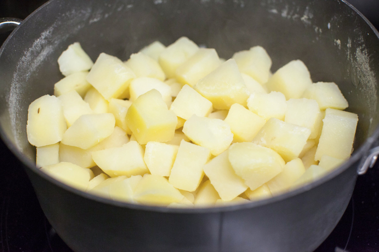 2. Όπως ήδη είπαμε, το… μέγεθος παίζει ρόλο, γι’ αυτό προτιμήστε να κόψετε τις πατάτες σε ίσα τετραγωνάκια που θα βράσουν πιο εύκολα και θα επεξεργαστείτε καλύτερα μετά.