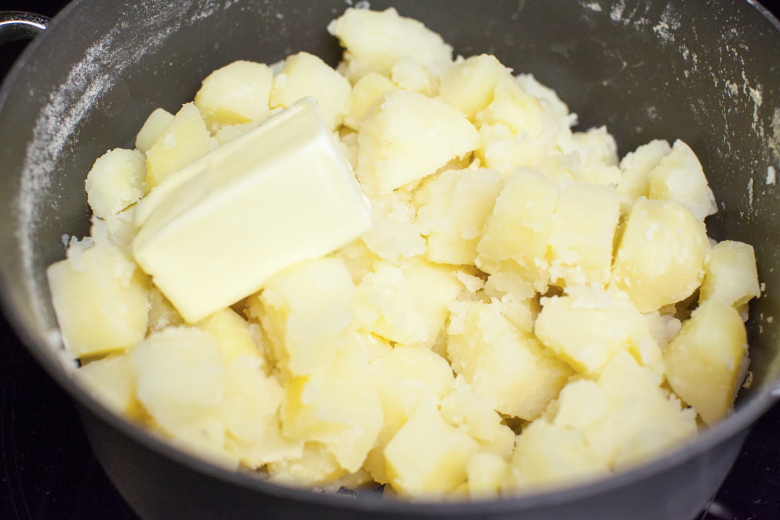 Προσθέστε το βούτυρο και το πιπέρι, αφήστε το να λιώσει μέσα στις πατάτες και ανακατέψτε το με μια ξύλινη κουτάλα ή μια σπάτουλα από σιλικόνη.