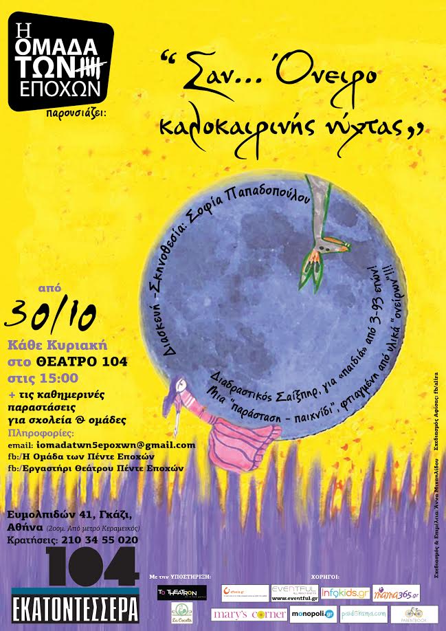 Με αφορμή τα 400 χρόνια από τον θάνατο του μεγάλου δημιουργού, «Η ομάδα των Πέντε Εποχών» επιλέγει το «Όνειρο καλοκαιρινής νύχτας», και κατά την γνωστή της πλέον μέθοδο, φτιάχνει μια «παράσταση – παιχνίδι» που εισάγει μικρούς και μεγάλους στον πολυσήμαντο κόσμο του Σαίξπηρ. Με οδηγό το θεατρικό παιχνίδι και την τεχνική του καθοδηγούμενου αυτοσχεδιασμού, οι θεατές/συμμετέχοντες ανακαλύπτουν, συνθέτουν, κατανοούν τους τρεις διαφορετικούς κόσμους που συμπλέκονται στο «Όνειρο»: τον κόσμο των ευγενών (της εξουσίας και της δικαιοσύνης), τον κόσμο των ξωτικών (της μαγείας και των μεταμορφώσεων) και τον κόσμο των μαστόρων (της απλής και ενίοτε κωμικής καθημερινότητας). Όπως ο Σαίξπηρ χρησιμοποιούσε την τεχνική του «ντουμπλαρίσματος» προκειμένου να ενδυναμώσει την ατμόσφαιρα και να δημιουργήσει συνδέσεις και αντιθέσεις μεταξύ των διαφορετικών κόσμων και χαρακτήρων του έργου έτσι και «Η Ομάδα των Πέντε Εποχών» με τέσσερις ηθοποιούς που υποδύονται όλους τους ρόλους προκαλεί ένα ξέφρενο παιχνίδι μεταμορφώσεων και ενισχύει το φαντασιακό και το φανταστικό. Με σεβασμό στο πρωτότυπο κείμενο δημιουργεί μια «εύπεπτη» διασκευή που διατηρεί όλα τα στοιχεία που καθιέρωσαν το εν λόγω έργο ως το κορυφαίο δημιούργημα της πρώτης περιόδου του συγγραφέα. Χιούμορ, φαντασία, παιχνίδι, φιλία, αγάπη, επιθυμία, όνειρο, ισότητα, σχέσεις, οικογένεια, όρια, ζωντανή μουσική και ήχοι είναι μερικά μόνο, από τα «υλικά» που συνθέτουν μια διαδραστική παράσταση που αφορά όλους και συνεπαίρνει «παιδιά» από 3 έως 93 ετών.