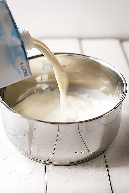 Σε ένα σκεύος βάλτε το γάλα σε μεσαία φωτιά μέχρι να ζεσταθεί αρκετά, χωρίς όμως να βράσει.