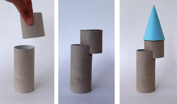 Έπειτα, προσθέστε τη σκεπή και κάντε μικρές εγκοπές στα ρολά που θα ακουμπούν στη βάση. Σε αυτές, εφαρμόστε τους πύργους που θα… αιωρούνται.