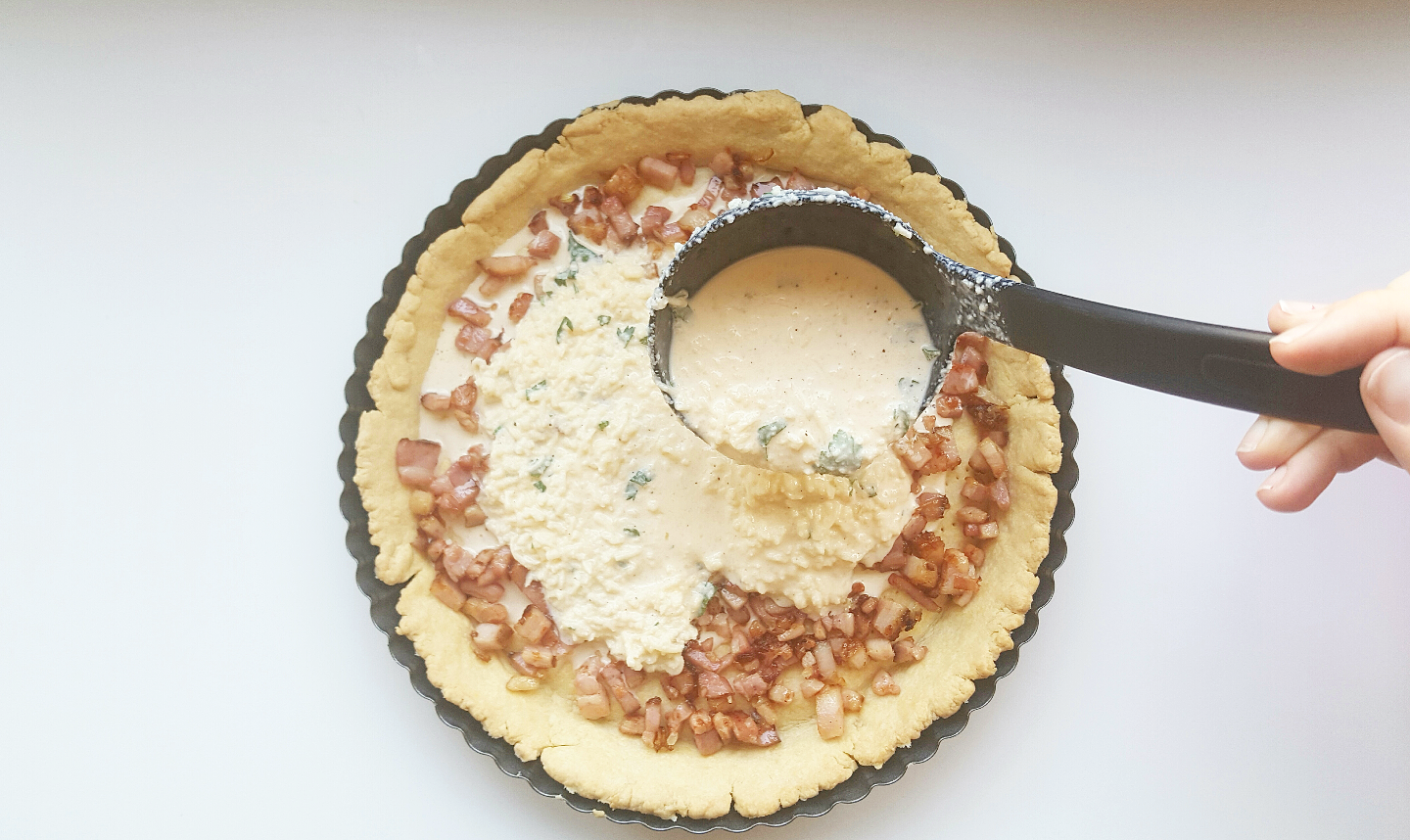 Ψήστε τη τάρτα σε προθερμασμένο φούρνο στους 180 βαθμούς για περίπου 30 λεπτά, μέχρι να ψηθεί η γέμιση και να χρυσίζει η επιφάνεια. Βγάλτε την από το φούρνο την αφήστε για 5-10 λεπτά να “ξεκουραστεί” πρωτού τη σερβίρετε!
