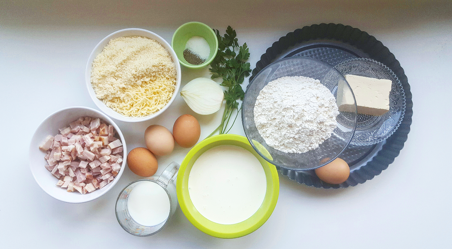 Ρίξτε σε ένα μπολ τα αβγά μαζί με το γάλα, την κρέμα γάλακτος, τα τριμμένα τυριά, τον μαϊντανό και το αλατοπίπερο και ανακατέψτε.