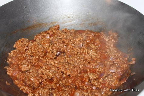 *Έπειτα, ρίχνετε λίγη πασάτα (μισό φλιτζάνι) και νερό (1/4 φλιτζανιού) και αφήνετε τον κιμά να σιγοβράσει για 5 λεπτά.