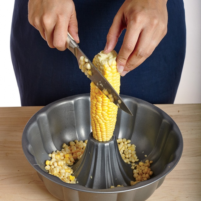 Μπορεί η κονσέρβα καλαμποκιού να είναι η εύκολη λύση, όμως αν προτιμάτε να καθαρίζετε φρέσκα καλαμπόκια πριν τα καταναλώσετε, εφαρμόστε το εξής τρικ: στηρίξτε το καλαμπόκι σε μια φόρμα για κέικ (φωτογραφία) και στη συνέχεια, «ξεφλουδίστε» το με ένα μαχαίρι. Η αντίσταση που θα κρατάτε στη φόρμα δεν θ’ αφήσει το καλαμπόκι να πέσει.