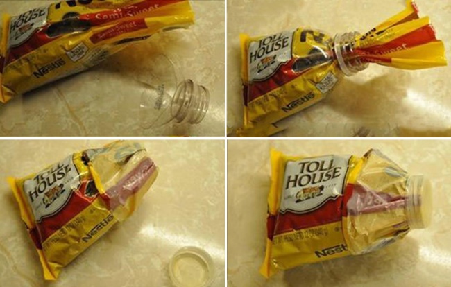 Κρατήστε ένα πλαστικό μπουκάλι εκτός της ανακύκλωσης και κόψτε το πάνω μέρος του μαζί με το καπάκι. Εφαρμόστε το στην πλαστική συσκευασία που θέλετε για να μην σας ξεφύγει ούτε γραμμάριο όταν την ανοίγετε και να κρατάτε φρέσκο το περιεχόμενό της. Δείτε στη φωτογραφία ακριβώς τον τρόπο.