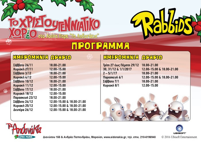Φέτος στις γιορτές, ζήστε μαζί με τα παιδιά σας μια μοναδική, τρελή, γιορτινή διασκεδαστική εμπειρία στο Χριστουγεννιάτικο Χωριό στο Λούνα Παρκ "Τα Αηδονάκια", παρέα με τα Rabbids!