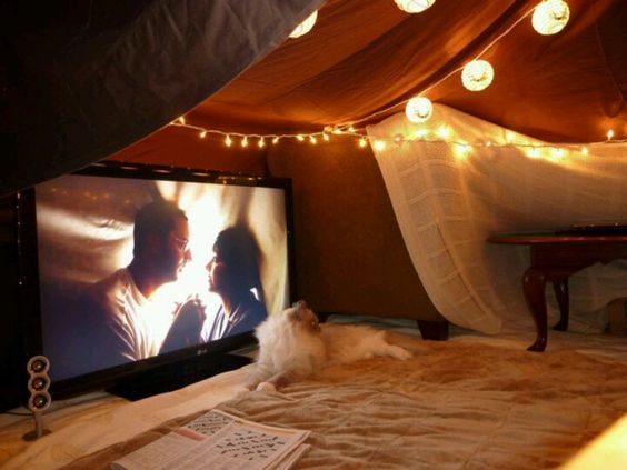 Βάλτε μαξιλάρια στο πάτωμα, απλώστε χοντρές κουβέρτες, κλείστε όλα τα φώτα, ανάψτε μικρά, χριστουγεννιάτικα φωτάκια και φτιάξτε ένα ζεστό καταφύγιο, που θα γίνει η αίθουσα προβολών σας.