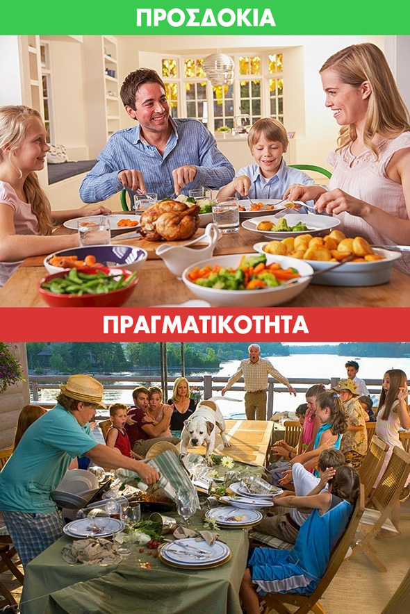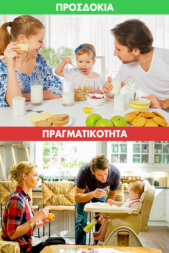 Η ώρα του φαγητού: Η προσδοκία είναι μάλλον μια καλοστημένη διαφήμιση. Η πραγματικότητα τα έχει όλα: φαγητό παντού και δύο γονείς να ικετεύουν το μωρό τους να βάλει δυο μπουκιές στο στόμα του.
