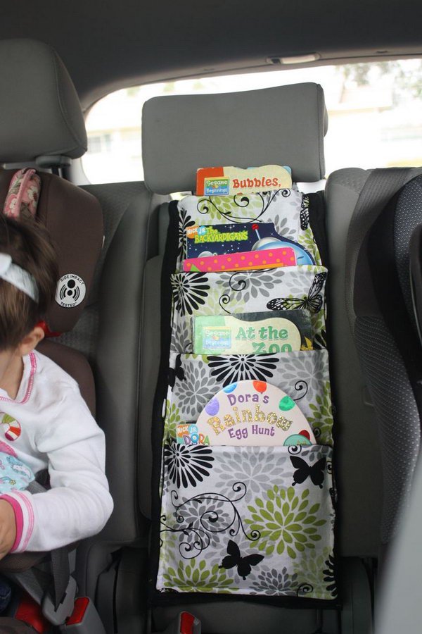 Στην ίδια λογική μια υφασμάτινη, κάθετη θήκη για μακιγιάζ μπορεί να χρησιμεύσει ως κινητή βιβλιοθήκη. Δέστε την στο μεσαίο κάθισμα για μεγαλύτερη ευκολία και για να έχει το παιδί άμεση πρόσβαση.