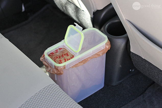 Εναλλακτικά, αν το αυτοκίνητο δεν είναι πολύ άνετο, μπορείτε να κρεμάσετε μια σακούλα για τα σκουπίδια σε ένα πλαστικό πιαστράκι: