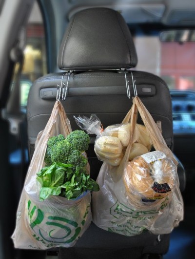 Για να μην χρειαστεί να ανοίγετε το πορτ μπαγκάζ για τα ψώνια του σούπερ μάρκετ, κρεμάστε τα σε γάντζους κρεμάστρες πίσω από το κάθισμα του αυτοκινήτου- φυσικά όχι στη θέση που κάθεται το παιδί για να μην τα ανοίξει.