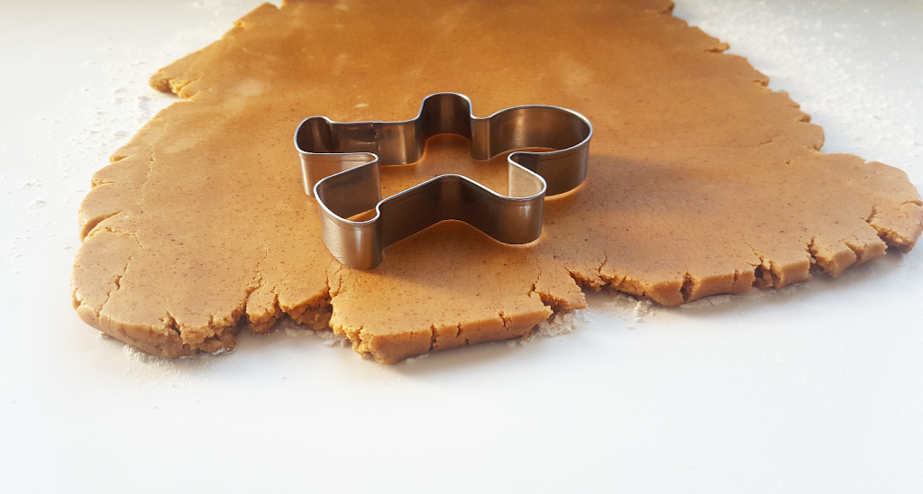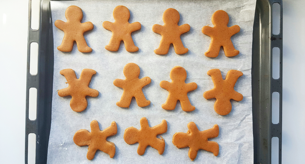 Με το κουπ πατ σχηματίστε τα ανθρωπάκια και τοποθετήστε τα σε ένα ταψί στο οποίο θα έχετε στρώσει χαρτί ψησίματος. Ψήστε σε προθερμασμένο φούρνο στους 180 βαθμούς Κελσίου για 8-10 λεπτά.