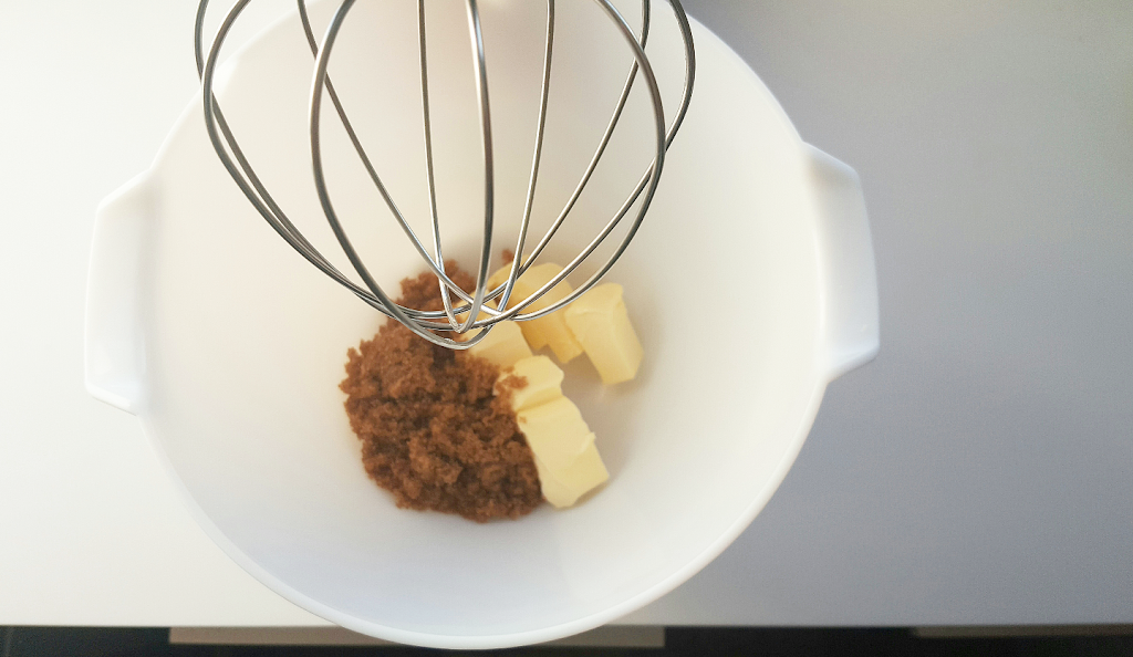 Με ένα μίξερ (χειρός η πάγκου) ανακατέψτε το βούτυρο με την ζάχαρη μέχρι να γίνει κρέμα για περίπου 10 λεπτά. Προσθέστε το πετιμέζι και το αβγό και χτυπήστε για ακόμα 5 λεπτά.