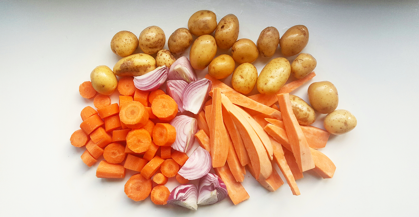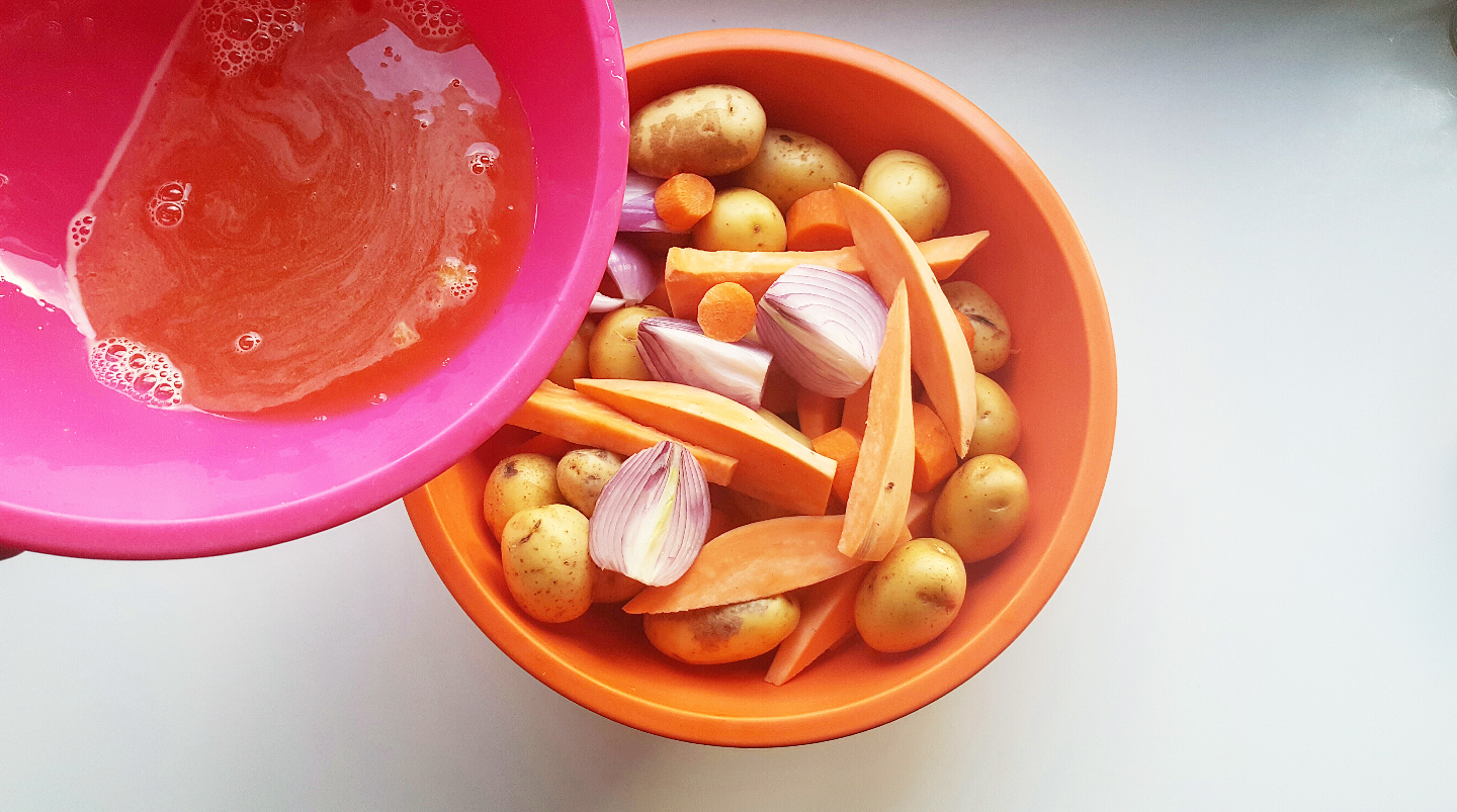 Πλένετε, καθαρίζετε τα λαχανικά και τα κόβετε σε χοντρά κομμάτια.