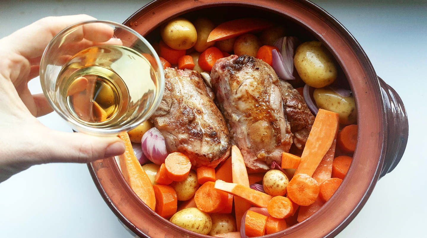 Τέλος, περιχύνετε με κρασί, κλείνετε το καπάκι και ψήνετε στους 200 βαθμούς για μια ώρα.