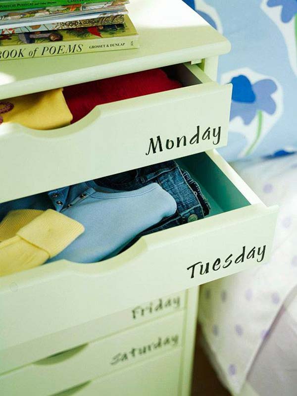 Σε κάθε συρτάρι, γράψτε τις ημέρες της εβδομάδας και βάλτε μέσα τα ρούχα που θα φοράει το παιδί κάθε πρωί. Η «συμφωνία» είναι να τα βάλει στη θέση του στο τέλος της ημέρας έτσι ώστε εσείς να δείτε ποια είναι λερωμένα για να τα πλύνετε.