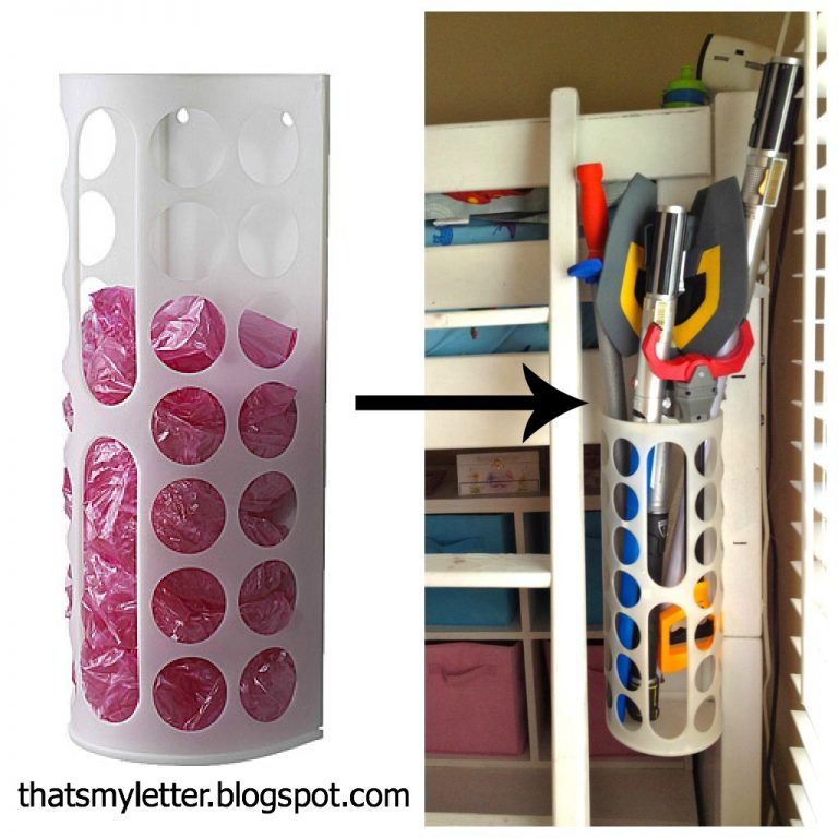 Οι κάθετες, πλαστικές θήκες για τις σακούλες του σούπερ μάρκετ είναι ιδανικές για τα σπαθιά και όλα τα μακρόστενα παιχνίδια : είναι ορατά, δεν πέφτουν, δεν μπερδεύονται με άλλα παιχνίδια και δεν φθείρονται.