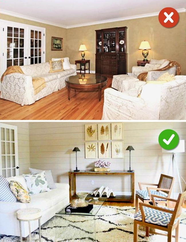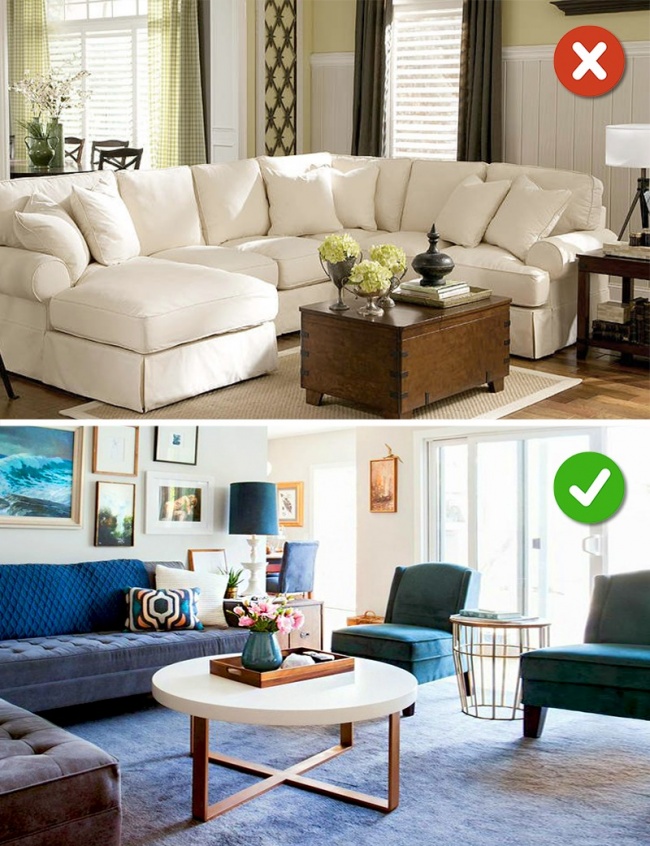 Ένα από τα πιο συνηθισμένα λάθη, λένε οι απανταχού διακοσμητές, είναι το να επιλέγουμε ογκώδη έπιπλα σε μικρά σαλόνια. Αν το σαλόνι σας δεν είναι αεροδρόμιο, τότε προτιμήστε διθέσιους καναπέδες και πολυθρόνες, αντί για έναν πολύ μεγάλο καναπέ που θα καταλάβει όλο τον χώρο.