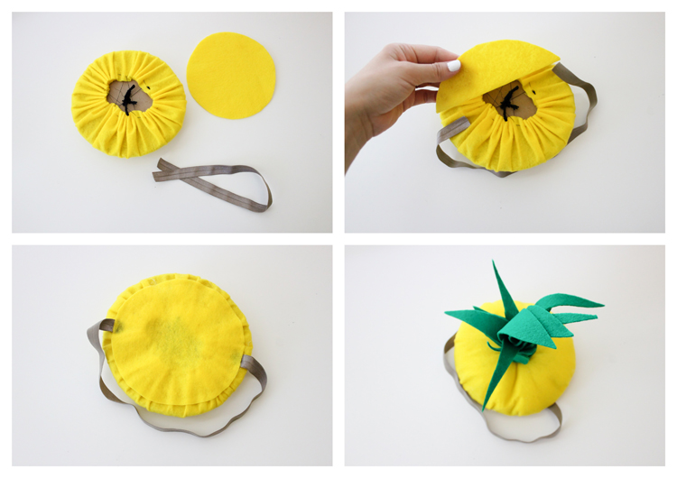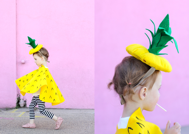 Για την κάπα του ανανά, ζωγραφίστε τις μαύρες γραμμές του με τον μαρκαδόρο κάνοντας τριγωνάκια και υπολογίστε απλώς τα μέτρα του παιδιού στην περιοχή του λαιμού, για να την κόψετε σε σχήμα χαμόγελου.