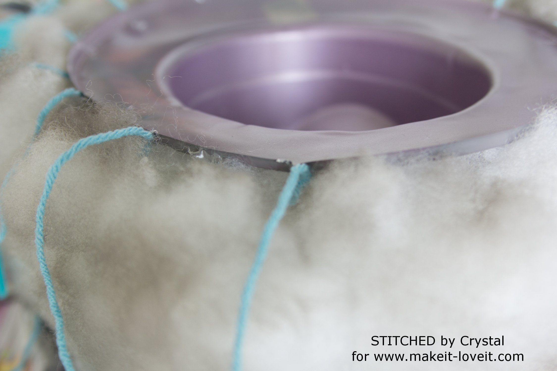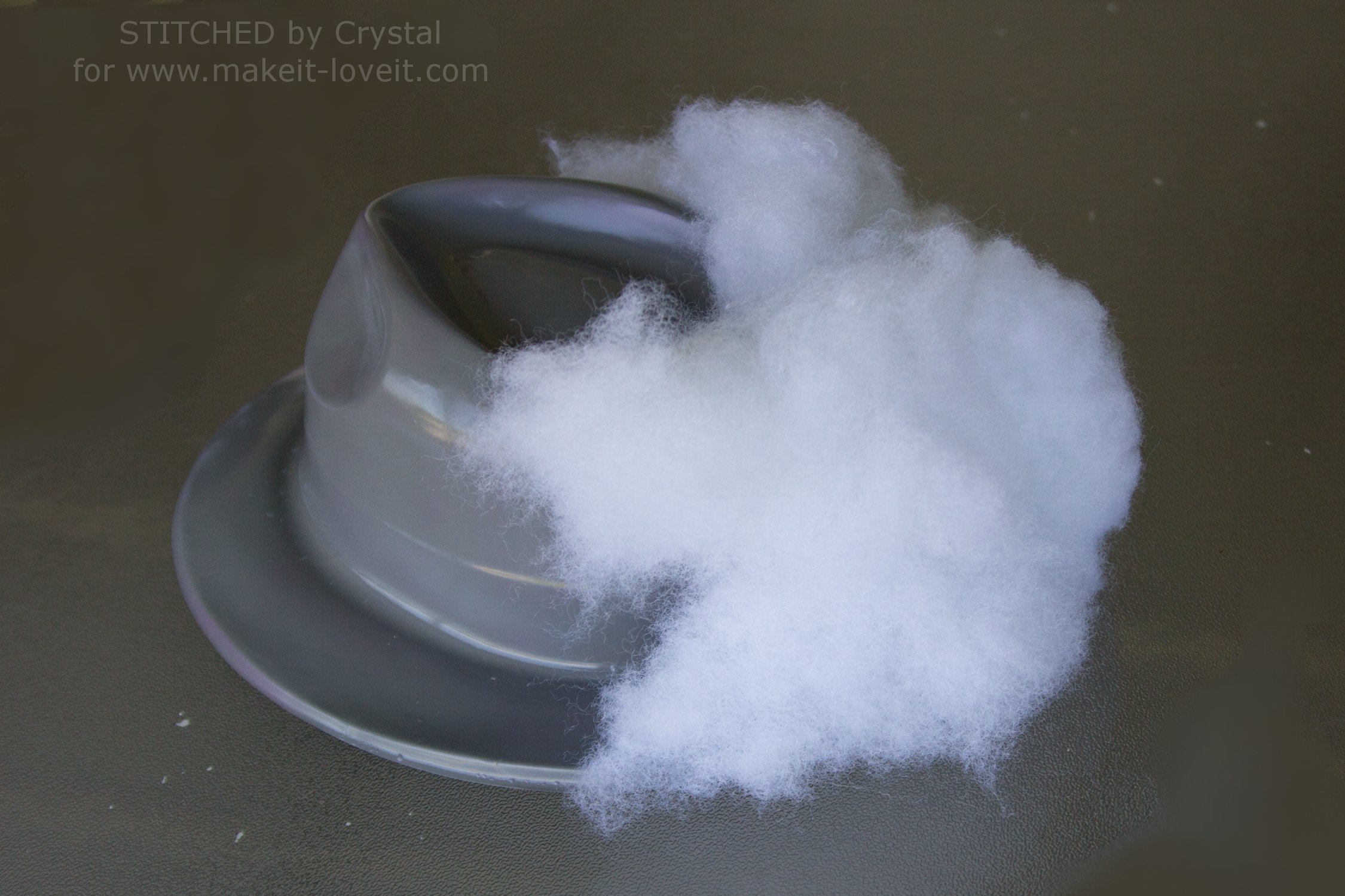 Βάψτε το καπέλο με την γκρι μπογιά (για την περίπτωση που εμφανιστεί κάτω απ' το σύννεφο). Στη συνέχεια, ψεκάστε το με την κόλλα σε σπρέι και αρχίστε να κολλάτε πάνω τον πολυεστέρα, μέχρι να πάρει το πάχος που θέλετε. Στο τέλος, ψεκάστε την γκρι μπογιά.