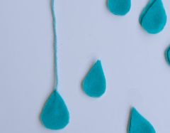 Έπειτα, φτιάξτε τις «ψιχάλες» με την μπλε τσόχα και το νήμα και κολλήστε την άκρη του στο καπέλο με το πιστόλι σιλικόνης.