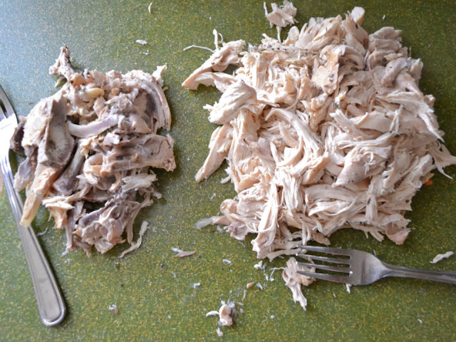 Έπειτα από μία ώρα, απομακρύνετε το κοτόπουλο από την κατσαρόλα. Με δύο πιρούνια, αφαιρέστε το κρέας από το στήθος και κόψτε το σε μικρά κομματάκια. Προσθέστε τουλάχιστον μία κουταλιά της σούπας αλάτι- αν προτιμάτε, και περισσότερο!