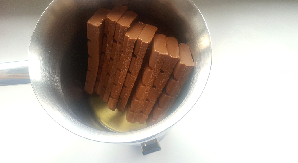 Σε ένα μεγάλο μπρίκι, λιώστε σε πολύ χαμηλή φωτιά την κουβερτούρα με 1 κουταλάκι του γλυκού ελαιόλαδο. Αν την προτιμάτε, επιλέξτε την κλασική μέθοδο του μπεν μαρί.