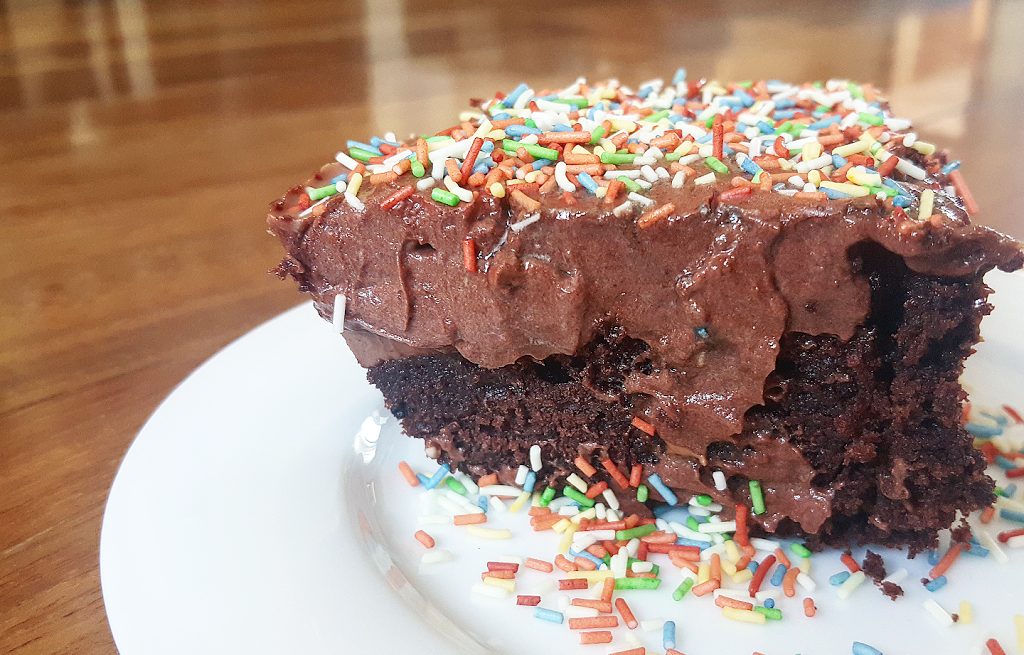 Αφήστε το να κρυώσει 10 λεπτά και μετά περιχύστε την λιωμένη κουβερτούρα πάνω απ' τις τρύπες και το κέικ και στρώστε την κρέμα ζαχαροπλαστικής.