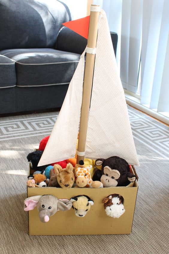 Aφαιρέστε το πάνω μέρος της κούτας, κόβοντάς το με ένα καλό ψαλίδι ή κοπίδι. Ανοίξτε τρεις τρύπες σε κάθε πλευρά (χρησιμοποιώντας διαβήτη ή ένα μικρό πιατάκι για να είναι οι κύκλοι ίδιοι). Ενώστε με χαρτοταινία μερικά ρολά από χαρτί υγείας, για να φτιάξετε το κατάρτι, κολλήστε το στον πάτο της κιβωτού και κρεμάστε πάνω του τριγωνικά κομμάτια από χαρτόνι για πανιά. Επιβιβάστε τα ζωάκια και το παιχνίδι μπορεί να ξεκινήσει.