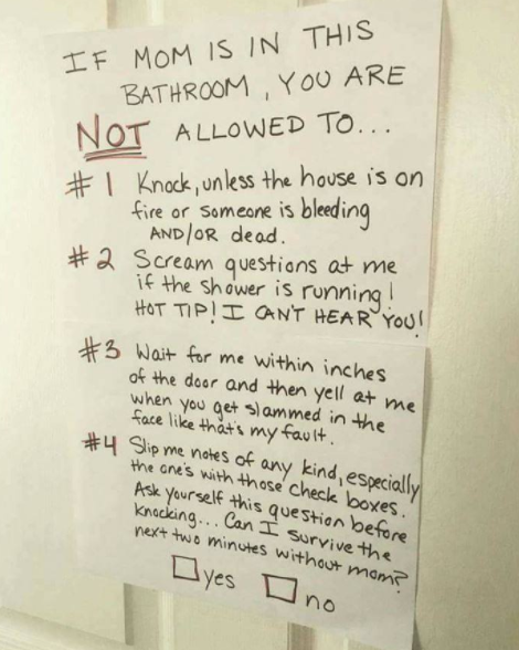 #4 Να γλιστράτε σημειώματα κάθε είδους κάτω απ’ την πόρτα, ειδικά αυτά που πρέπει να τικάρεις ένα κουτάκι. Ρωτήστε τον εαυτό σας πριν χτυπήσετε την πόρτα… Μπορώ να επιβιώσω τα επόμενα δύο λεπτά χωρίς τη μαμά;