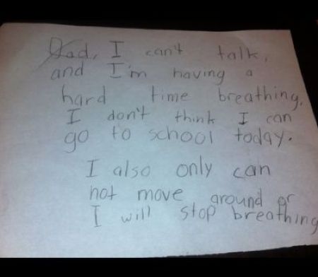 8. «Μπαμπά, δεν μπορώ να μιλήσω και αναπνέω δύσκολα. Νομίζω ότι δεν μπορώ να πάω στο σχολείο σήμερα. Αν κουνηθώ, θα σταματήσω ν’ αναπνέω.»: τα ψέματα είναι πολύ πιο εύκολα όταν γράφονται.