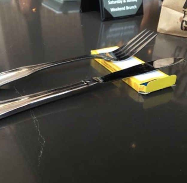 3. Αυτό το παιδί δεν ήθελε τα μαχαιροπίρουνά του να ακουμπήσουν στο τραπεζάκι και χρησιμοποίησε τη συσκευασία με τις κηρομπογιές για να πετύχει τον σκοπό του.