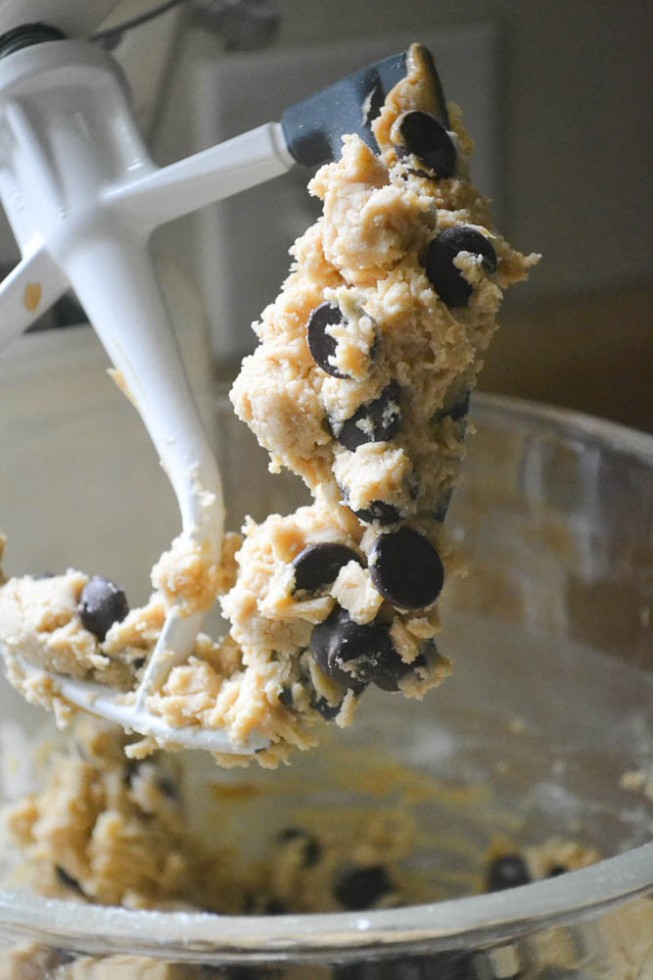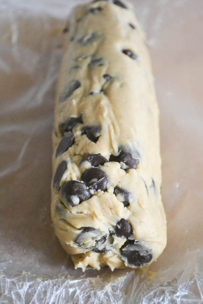 Προσθέστε τις σταγόνες σοκολάτας, και τοποθετήστε τη ζύμη που έχετε φτιάξει σε ένα φύλλο ψησίματος. Με προσεκτικές κινήσεις, «δουλέψτε» τη ζύμη έτσι ώστε να σχηματίσετε έναν κορμό. Αν έχει ακόμα «γρομπαλάκια», συνεχίστε να την δουλεύετε με τα χέρια σας. Έπειτα, τυλίξτε τον κορμό στο χαρτί, φροντίζοντας να έχει όσο το δυνατόν ομοιόμορφο σχήμα. Ασφαλίστε καλά τις άκρες του και αφήστε τον να παγώσει στο ψυγείο για τουλάχιστον δύο ώρες. Υπολογίστε ότι ο κορμός θα πρέπει να έχει μήκος περίπου 20 εκατοστά.