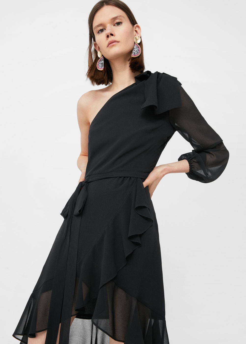 Το μικρό μαύρο φόρεμα σε μια πιο πρωτότυπη εκδοχή. Ένα μανίκι, φιόγκος στη μέση και ασύμμετρο τελείωμα που- περιέργως- «δένουν» αρμονικά μεταξύ τους.