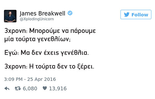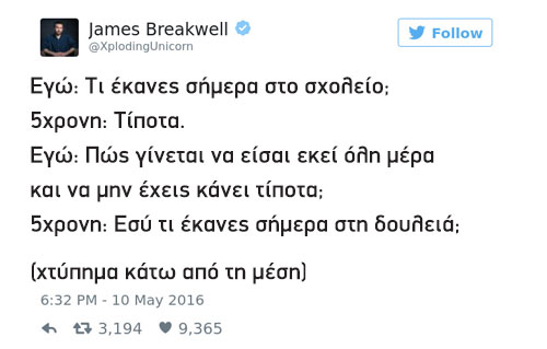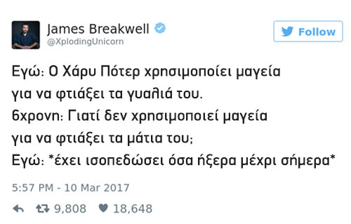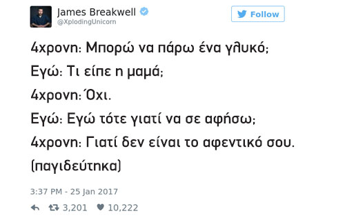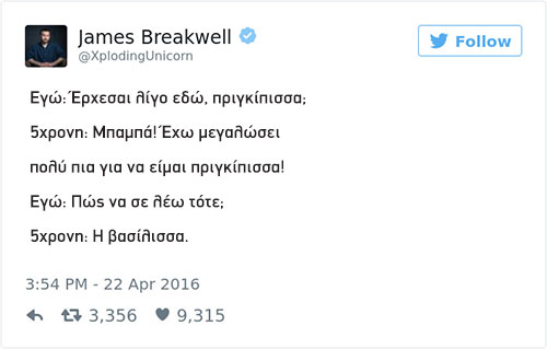Ο James Breakwell θα μπορούσε να αποτελεί πρότυπο μπαμπά. Ωστόσο, έχοντας 4 κόρες να «κουμαντάρει» τα πράγματα δεν είναι πάντα τόσο εύκολα. Ο κωμικός συγγραφέας και οικογενειάρχης από την Indianapolis της Αμερικής άνοιξε έναν λογαριασμό στο τουίτερ τον Απρίλιο του 2016, στον οποίον «ανεβάζει» όλα τα ευφυολογήματα της «σπείρας» του και από τότε έχει αποκτήσει 750 χιλιάδες ακόλουθους που δεν χορταίνουν να απολαμβάνουν όσα λένε οι μικρές του.