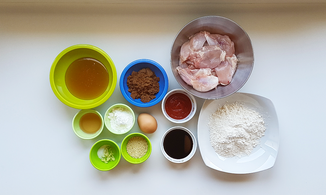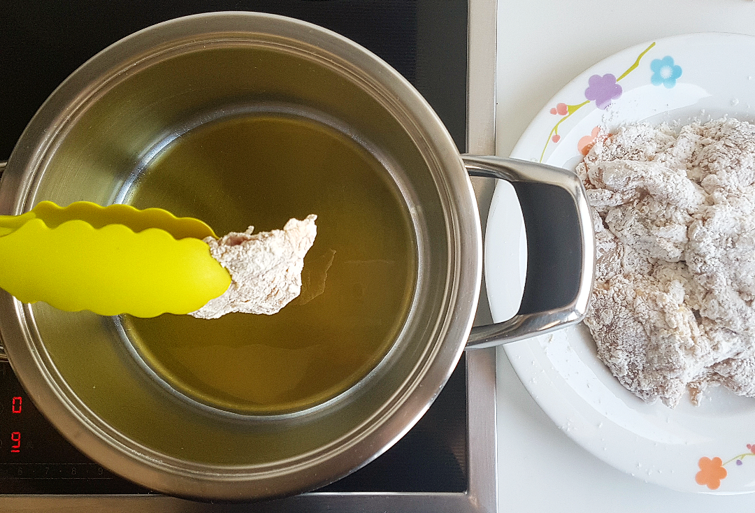 Σε τρία ξεχωριστά μπολ βάλτε το αλεύρι, το αυγό (ελαφρώς χτυπημένο) και το κορν φλάουρ. Αλατίστε ελαφρώς το κοτόπουλο και, με την παραπάνω σειρά, πανάρετε.