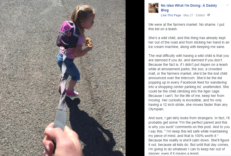 Από την άλλη, πολλοί άγνωστοι με κοιτάζουν με μισό μάτι. Είμαι σίγουρος, ότι κάτω από αυτό το post θα υπάρξουν σχόλια του τύπου “Είμαι ο τέλειος γονιός, κι αυτός είναι ο λόγος που εσύ δεν θα γίνεις ποτέ”, οπότε προς όλους εσάς, έχω να πω το εξής: Εγώ κρατάω ασφαλές το παιδί μου, ενώ διατηρώ την ψυχική μου ηρεμία, και για τον λόγο αυτό το λουρί αξίζει 100% τον κόπο. Γιατί η αλήθεια είναι, ότι θα ηρεμήσει. Θα το καταλάβει κάποια στιγμή, όπως κάθε παιδί. Αλλά μέχρι να έρθει εκείνη η μέρα, εγώ θα κάνω ό,τι μπορώ για να την κρατήσω μακριά από τους κινδύνους, ακόμα κι αν αυτό σημαίνει να της φοράω λουρί.»