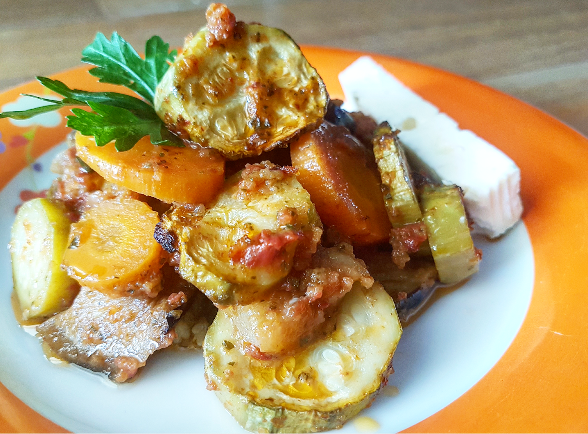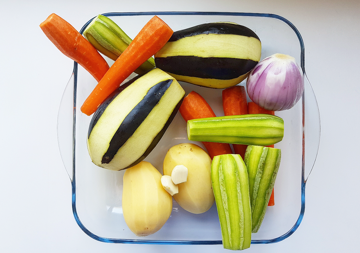 Κόψτε τα λαχανικά σε μικρούς κύβους και τοποθετήστε τα σε ένα μεγάλο πυρέξ ή σε ένα βαθύ ταψί φούρνου.