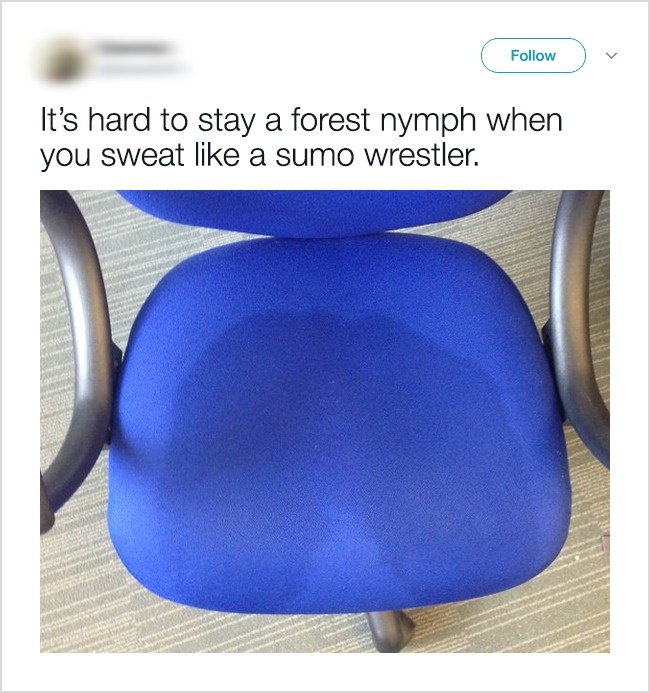 Όταν φοράς φόρεμα και, αφού σηκώνεσαι απ’ την καρέκλα, ο ιδρώτας έχει αφήσει το αποτύπωμά του κάπως έτσι: